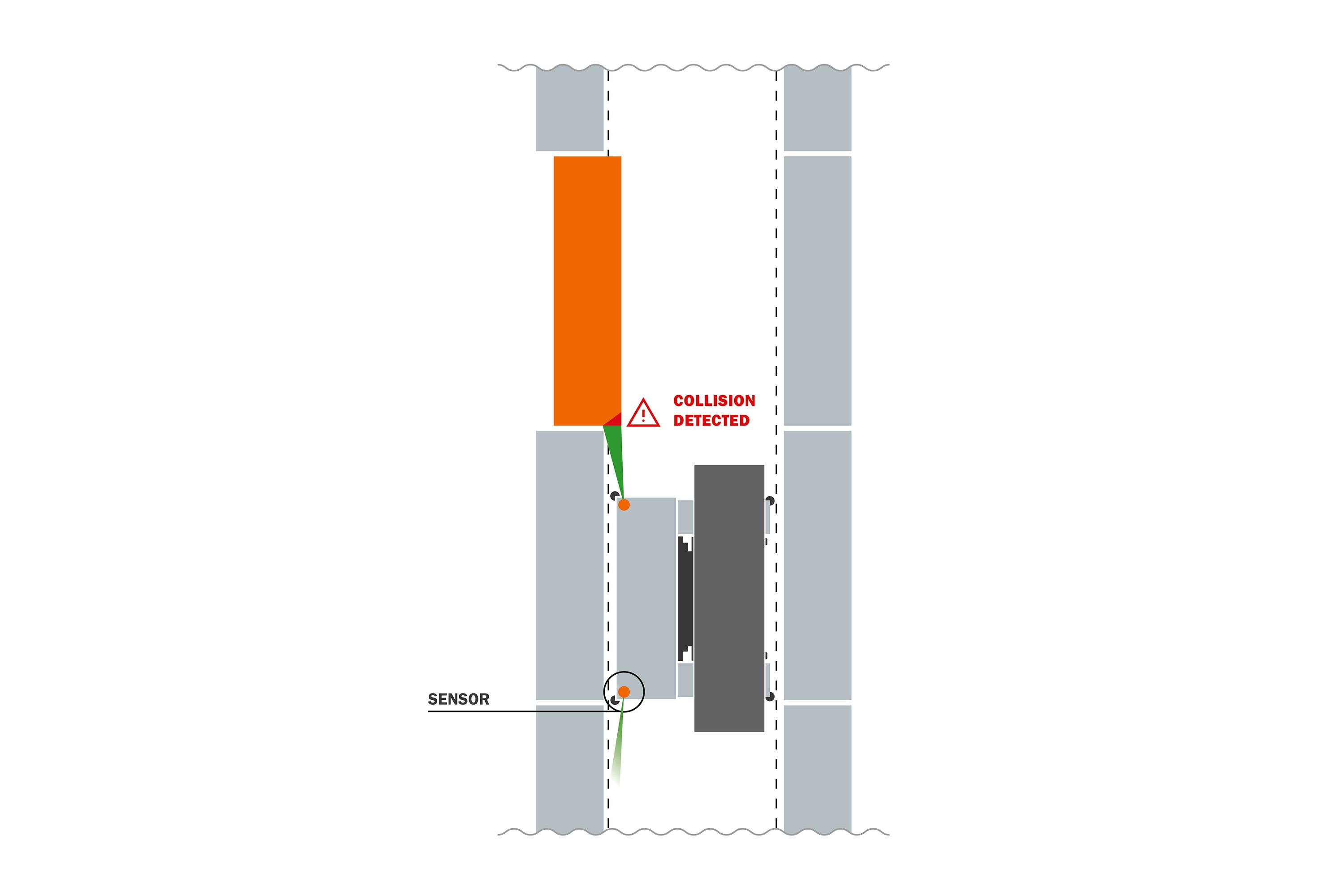 Om deze risico's te verminderen, heeft HUBTEX de Clear Aisle Assist ontwikkeld die de verticale gevarenzone langs de rekken bewaakt en indien nodig automatisch ingrijpt. Het systeem maakt gebruik van lidar‑-sensoren die verticale vlakken in de omgeving van het voertuig analyseren. Afhankelijk van de voertuigconfiguratie worden de sensoren op geschikte posities gemonteerd en scannen ze zowel in de hoofdrijrichting als daartegenin. Dit maakt het mogelijk om uitstekende ladingen vroegtijdig te detecteren, ongeacht of de zijlader voorwaarts of achterwaarts de gang inrijdt. Het bewaakte gebied past zich dynamisch aan belangrijke parameters aan: snelheid, hefhoogte en configuratie bepalen de grootte van de beschermingsvelden. Dit resulteert in een nauwkeurige, op behoeften gebaseerde detectie van potentiële botsingszones zonder de bestuurder te belasten met extra bedieningshandelingen.